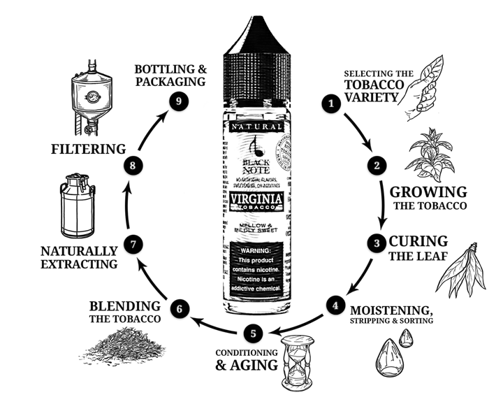 L'arôme du tabac est extrait en petits lots pour conserver la saveur unique de chaque mélange. Les produits Black Note ne contiennent aucun composé synthétique ni arôme artificiel, comme le diacétyle, l'acétyl propionyl, l'éthylène glycol et le diéthylène glycol. Ils n'utilisent que des graines de tabac sans OGM et choisissent soigneusement les lignées de cultivars les plus supérieures de Nicotiana Tabacum pour une extraction à froid naturelle.